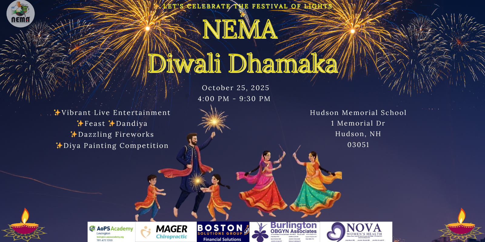 Join us for NEMA Diwali 2025 – a magical evening of Dandiya beats, delicious treats, and fireworks in the sky!